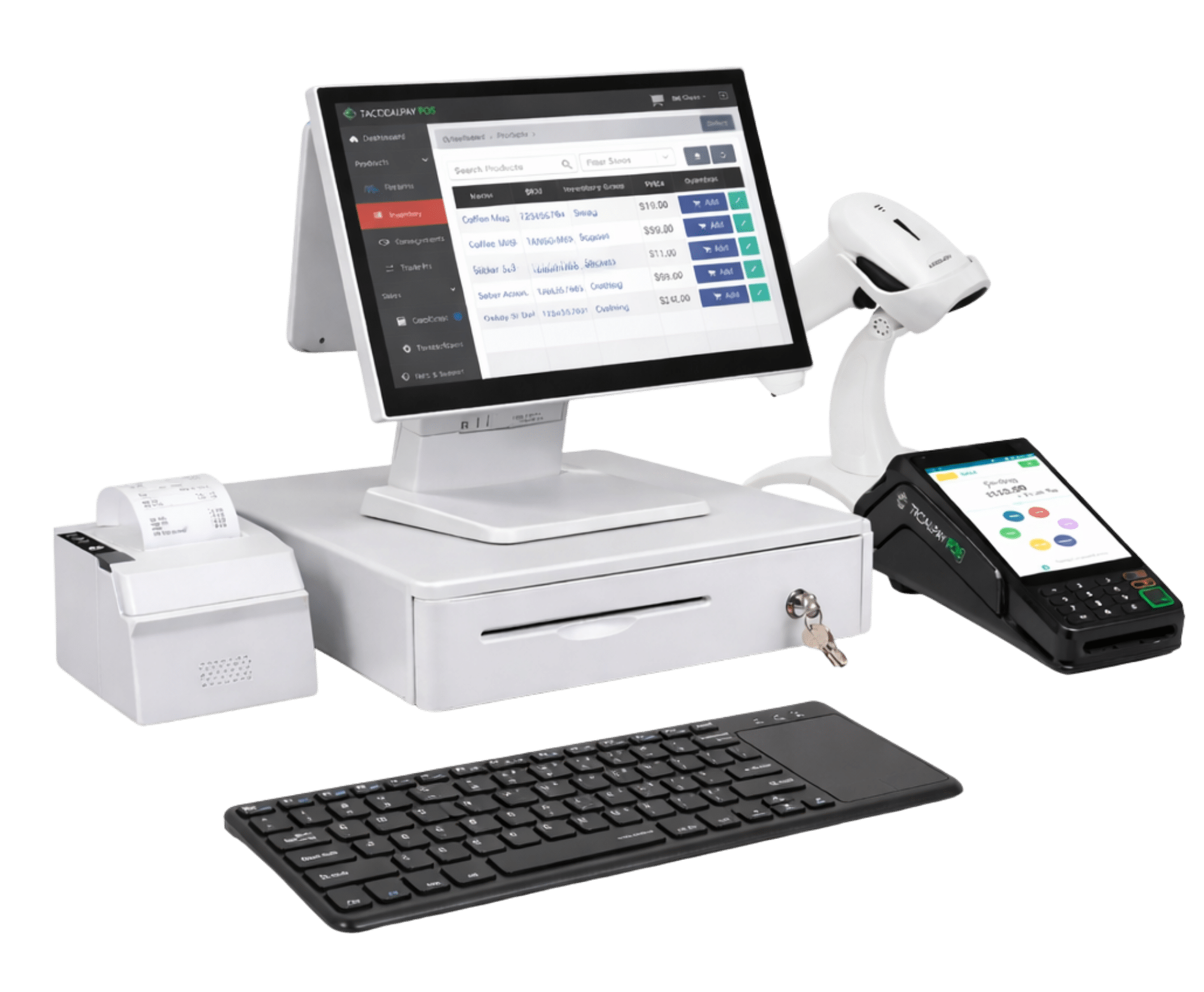 The complete TacticalPay POS hardware bundle is $999 and includes: 15.6″ dual-screen POS terminal, TacticalPay P1 payment terminal, wireless 2D barcode scanner, 80mm thermal receipt printer, cash drawer, and wireless keyboard with touchpad. A hardware-only bundle without the P1 payment terminal is available at $699. Financing is available for qualified customers.